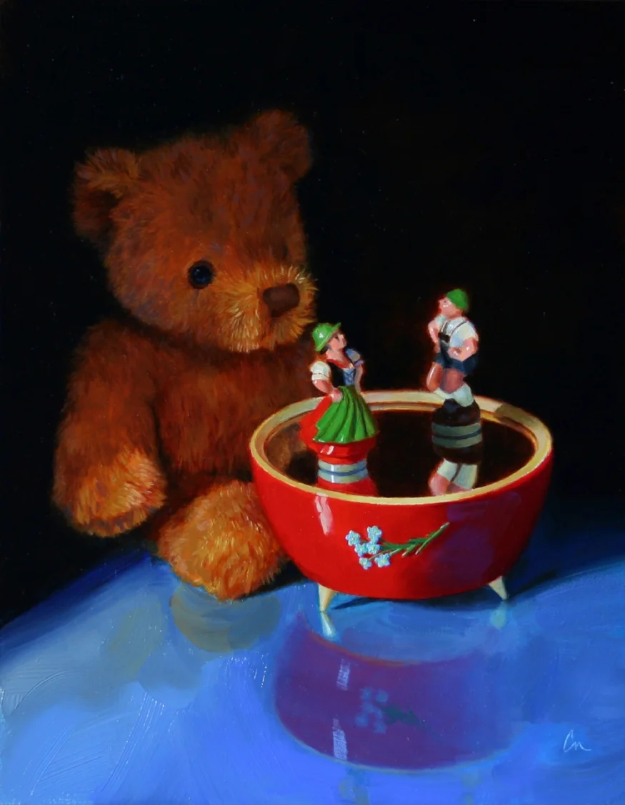My daughter gave me the bear. She said that everybody needs a bear to hug. In “Tanzbünhe”, I wanted the toys to interact… to see each other, across the generations.